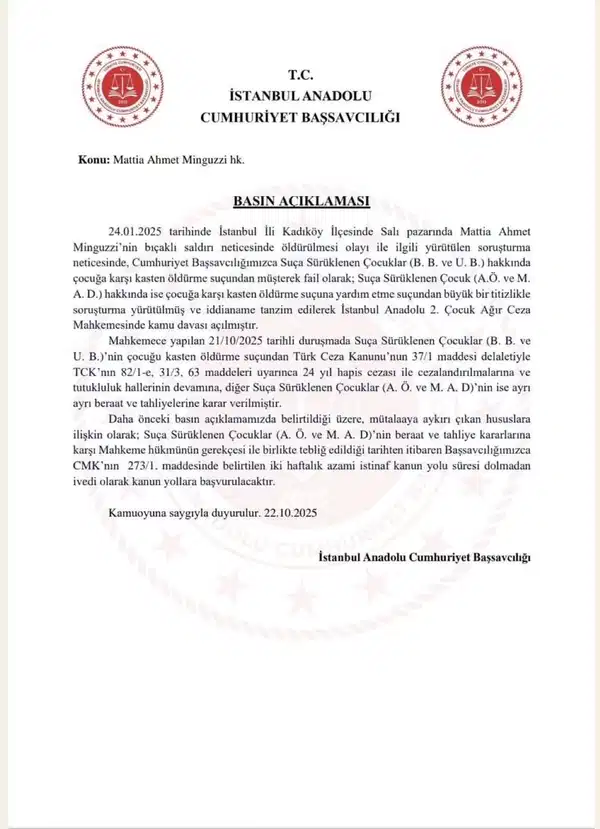 İstanbul Anadolu Cumhuriyet Başsavcılığı, Mattia Ahmet Minguzzi davasına ilişkin süren tartışmalar üzerine ikinci açıklamasını yaptı. Savcılık, beraat eden sanıklar A.Ö. ve M.A.D. hakkındaki kararların mütalaaya aykırı olduğunun altını çizdi.
