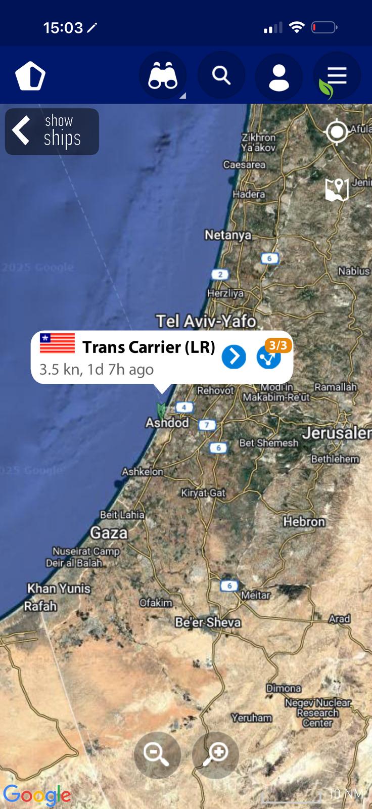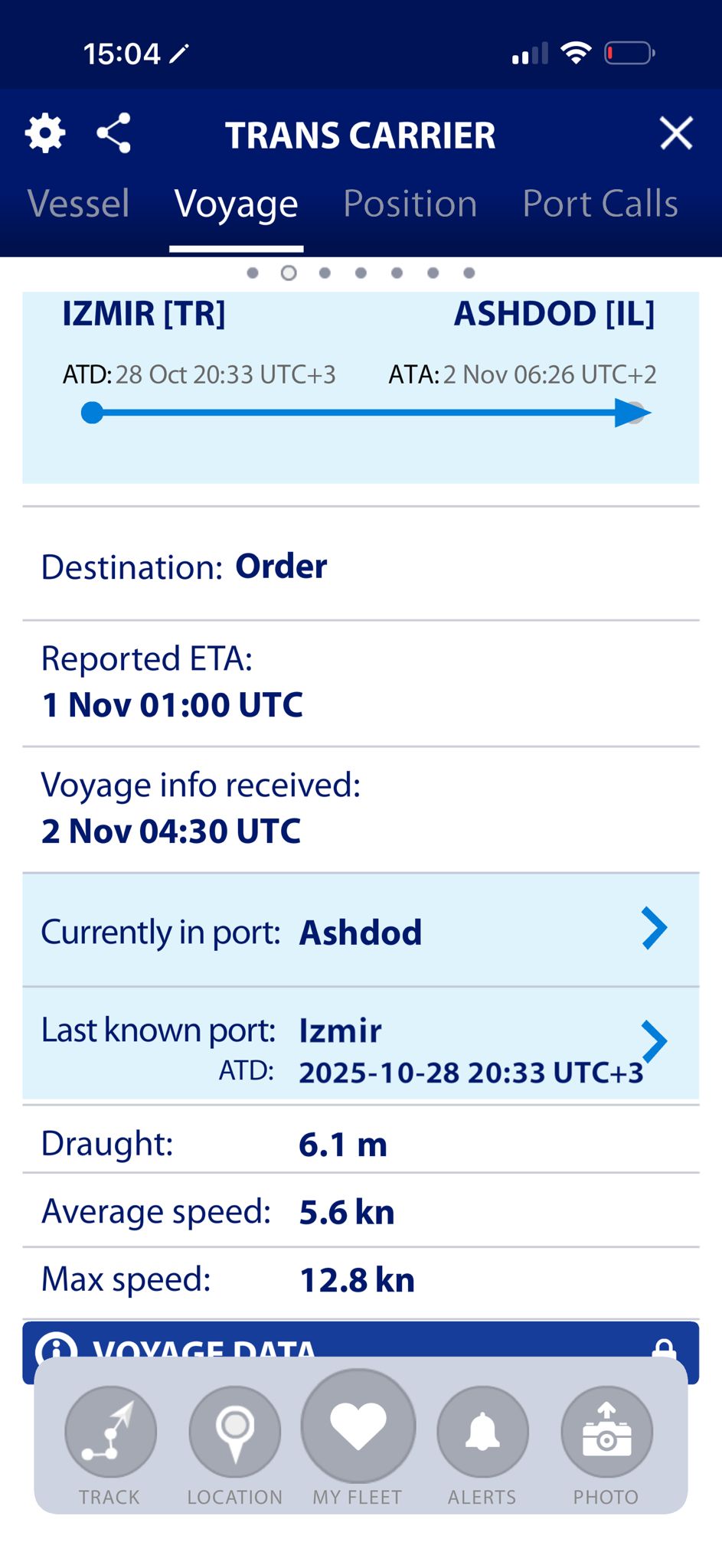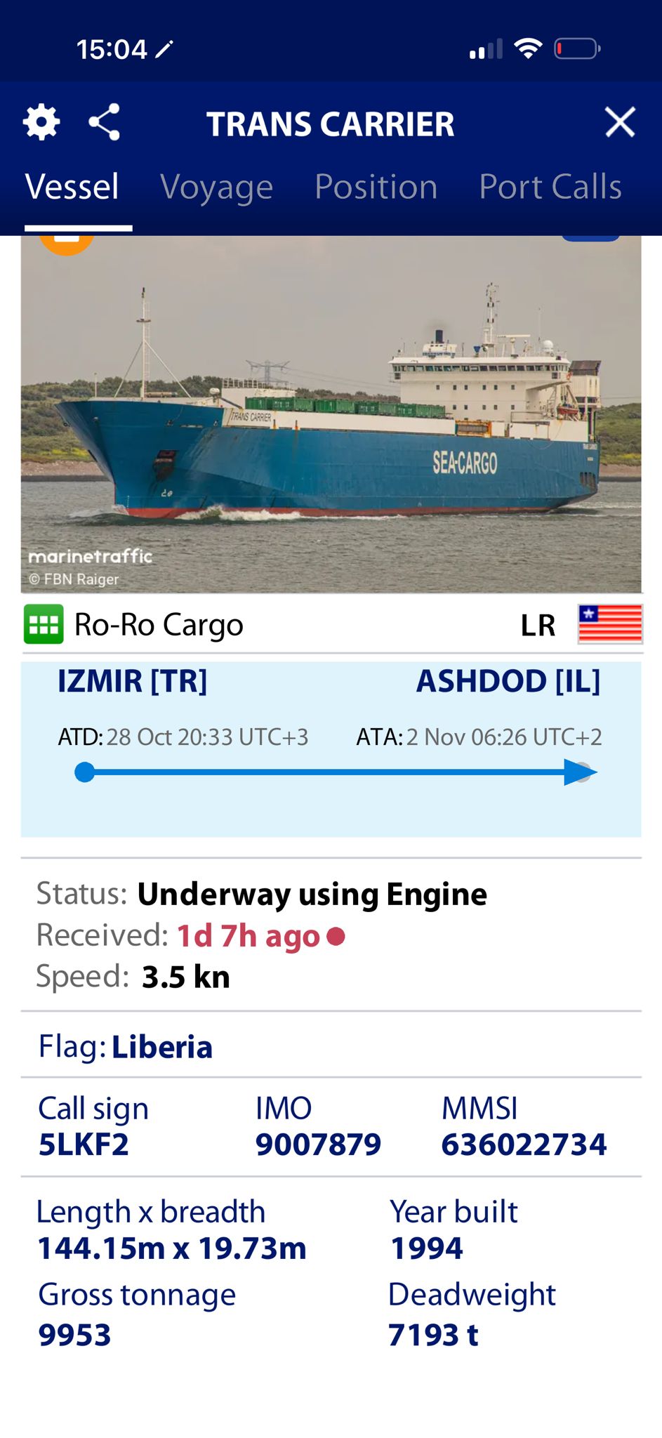 “TRANS CARRIER” isimli, Liberya bayraklı kargo gemisi 28 Ekim 2025 tarihinde saat 20.33’te İzmir Limanı’ndan kalkmış ve 2 Kasım 2025 tarihinde saat 06.26’da İsrail’in Ashdod Limanı’na ulaşmıştır.
