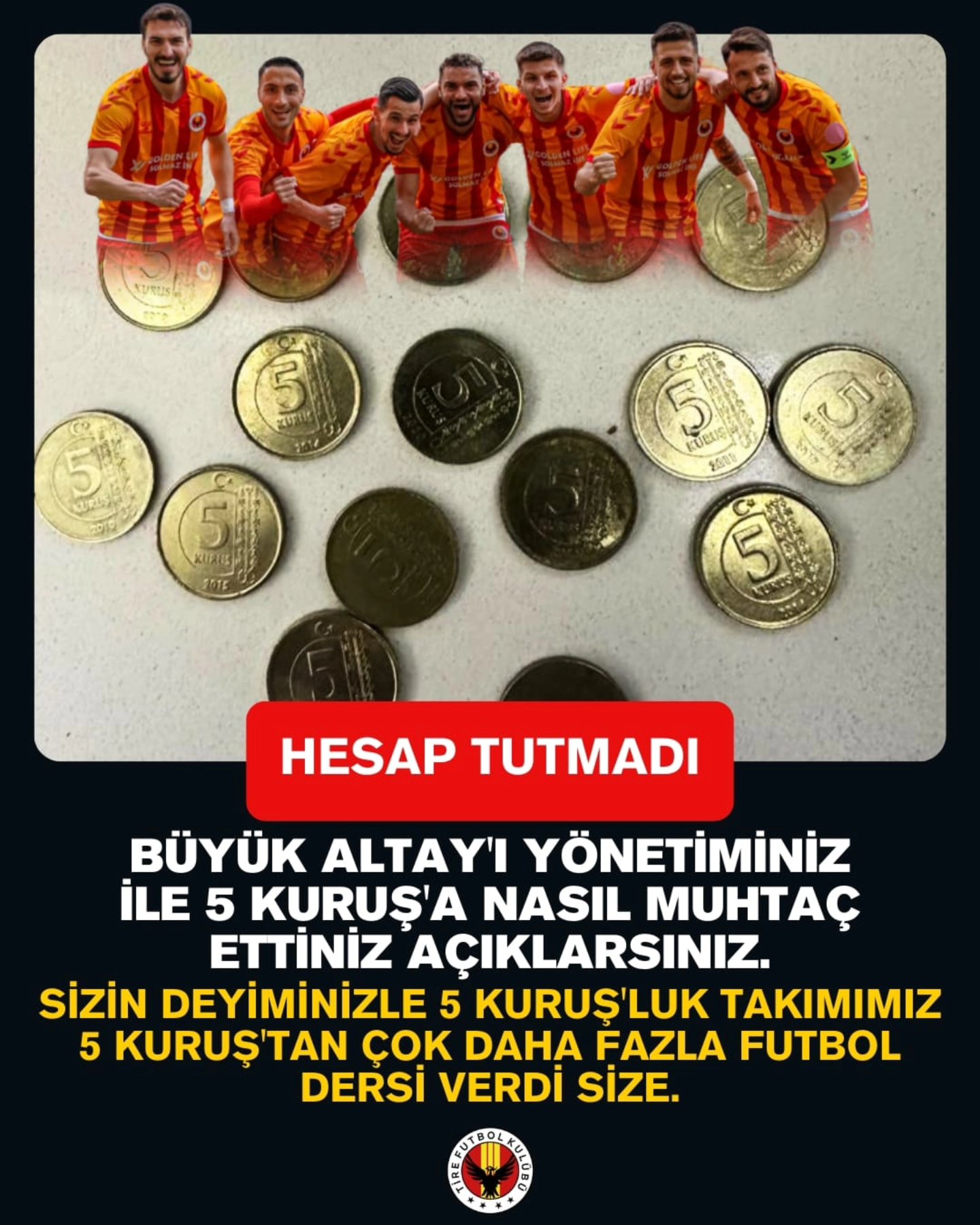 Tire 2021 FK yönetimi ise Alsancak Mustafa Denizli Stadı'nda 1-1 sona eren rövanşın ardından, "Hesap tutmadı" ifadeleriyle dikkat çeken sert bir paylaşım yayınladı. Tire FK'nın paylaşımında 5 kuruş görselleri yer alırken, "Büyük Altay'ı yönetiminiz ile nasıl 5 kuruşa muhtaç ettiniz açıklarsınız. Sizin deyiminizle 5 kuruşluk takımımız 5 kuruştan çok daha fazla futbol dersi verdi size" ifadeleri yer aldı. İzmir'in 112 yıllık temsilcisi Altay ile 5 yıl önce kurulan Tire 2021 FK bu sezon siyah-beyazlılar 3'üncü Lig'e düşünce tarihlerinde ilk kez rakip olmuştu. İki takım arasında ilk yarıda Tire'de oynanan ilk maçı 2-1 Altay kazanmıştı. (DHA)