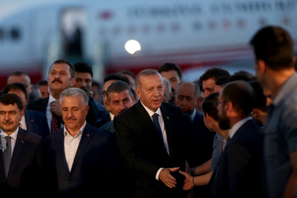 Cumhurbaşkanı Erdoğan'ı İstanbul Yeni Havalimanı'nda, Ulaştırma, Denizcilik ve Haberleşme Bakanı Ahmet Arslan, pilotlar, hostesler, hostlar, havalimanı işçileri karşıladı. Erdoğan, daha sonra tören mangasını selamladı.