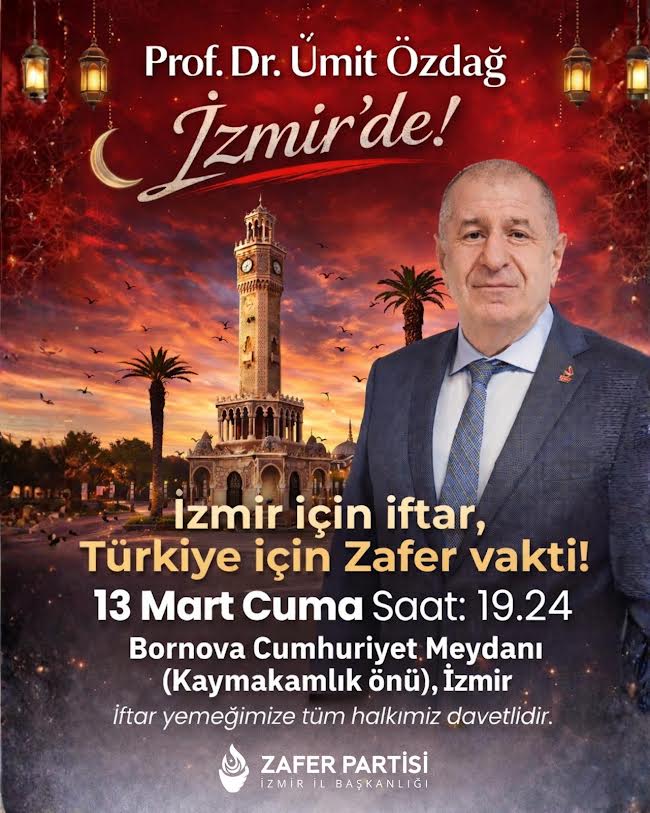 Zafer Partisi Genel Başkanı Ümit Özdağ, partisinin İzmir’de düzenleyeceği iftar programında vatandaşlarla bir araya gelecek.