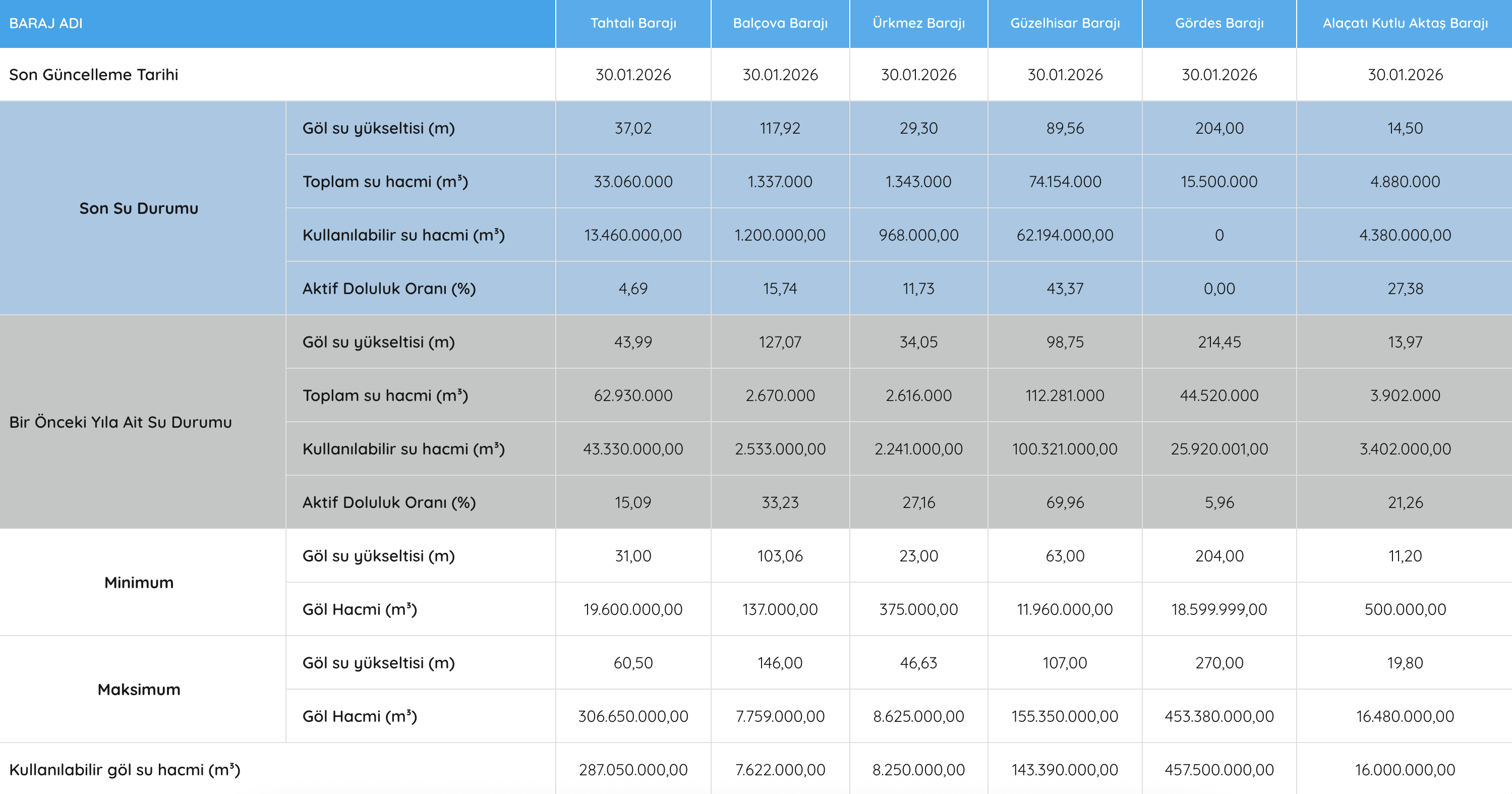 (30 Ocak 2026 Barajlardaki Su Durumu)