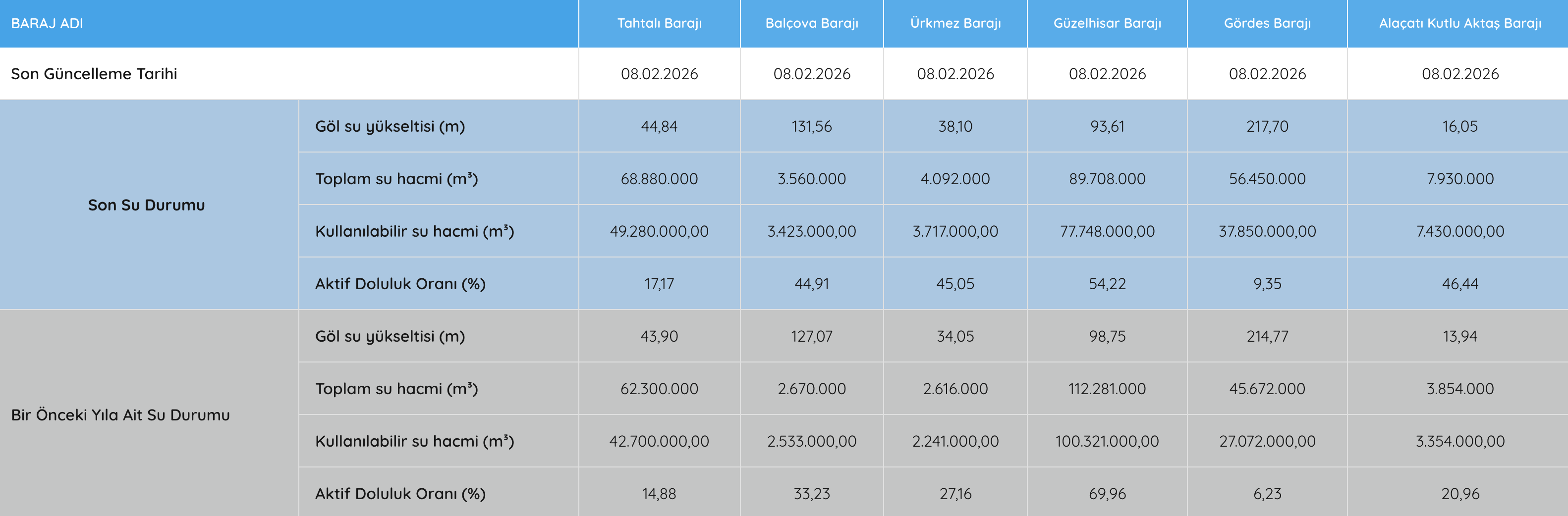 (8 Şubat 2026 Barajların Durumu)