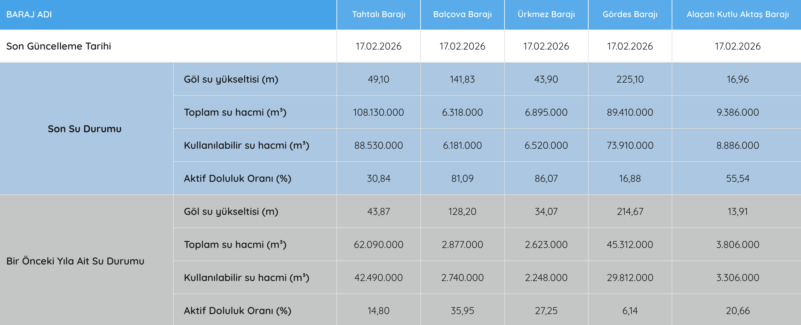 GERÇEKİZMİR - İzmir’de son haftalarda etkisini artıran yağışlar, kentin su kaynaklarına olumlu yansıdı. 17 Şubat 2026 tarihli verilere göre İzmir’i besleyen barajlarda hem su hacmi hem de doluluk oranlarında geçen yılın aynı dönemine kıyasla dikkat çeken yükseliş görüldü.
