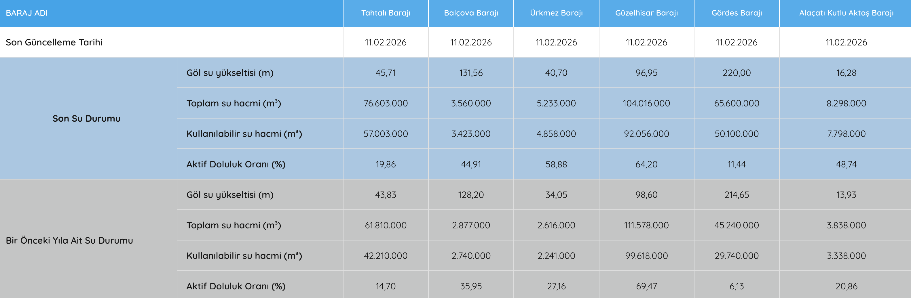 (11 Şubat 2026 Barajların Durumu)