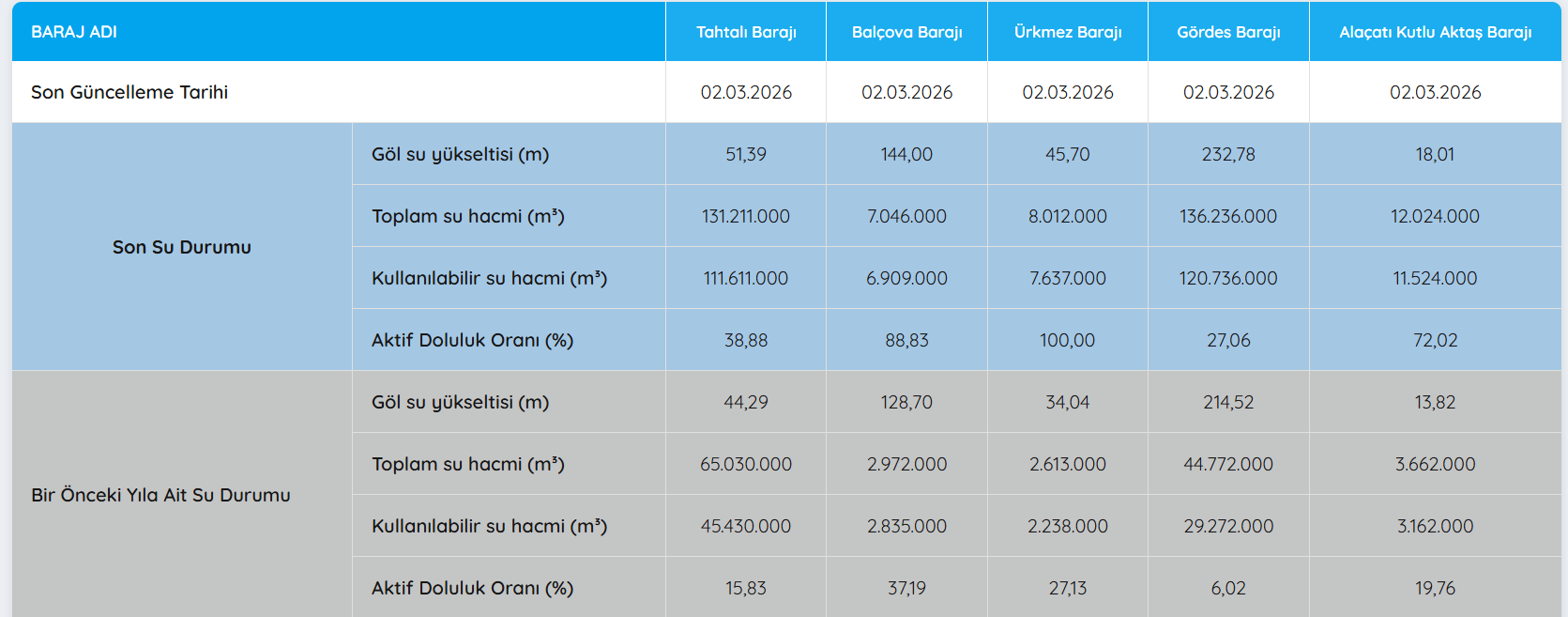 İZSU’nun 2 Mart 2026 tarihli verilerine göre İzmir’in en önemli içme suyu kaynaklarından Tahtalı Barajı’nda aktif doluluk oranı yüzde 38,88 olarak ölçüldü. Tahtalı Barajı’nda yağışların mola vermesi ile artış hızı düştü. Barajda 1 Mart Pazar günü doluluk oranı 37,70 olarak ölçülmüştü.