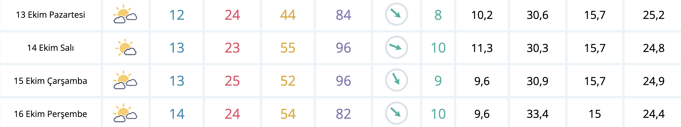 13 Ekim Pazartesi günü hava parçalı bulutlu olacak. En düşük sıcaklık 12, en yüksek sıcaklık ise 24 derece ölçülecek. Salı günü hava açık ve güneşli olacak, sıcaklık 13 ile 23 derece arasında değişecek.