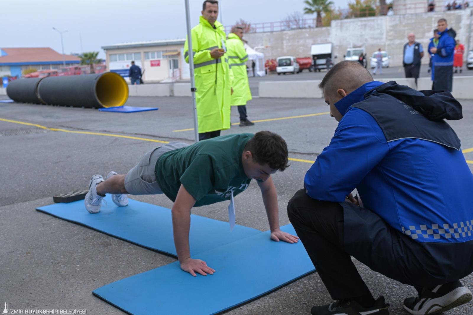 Uygulamalı sınav önce 100 metre engelli koşusu ile başladı. Ardından ağırlık kaldıran adaylar, 20 metrelik tünelden geçti. Bir dakika şınav ve mekik çektikten sonra ise sözlü sınava katıldı. İzmir Büyükşehir Belediyesi Genel Sekreter Yardımcısı İsmail Mutaf ile İzmir Büyükşehir Belediyesi Genel Sekreter Yardımcısı Çağatay Güç’ün de yer aldığı sözlü mülakatta, adaylar soru kitapçığını kura ile kendileri seçti. Adaylara Türkiye Cumhuriyeti Anayasası, Atatürk İlkeleri ve İnkılap Tarihi, 657 sayılı Devlet Memurları Kanunu, mahalli idarelerle ilgili temel mevzuat konularından sorular yöneltildi.